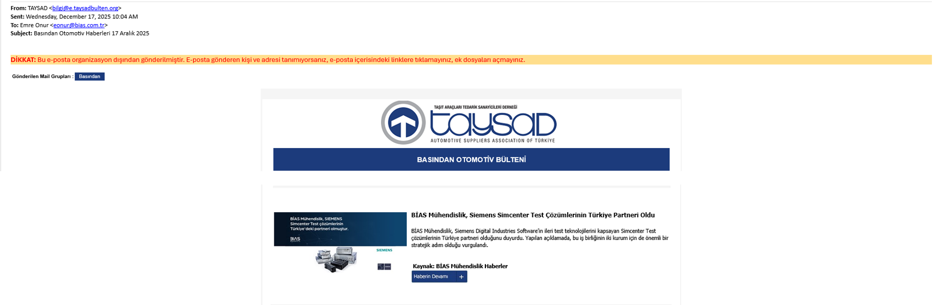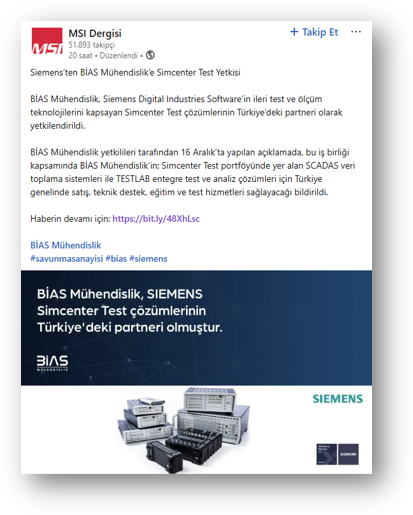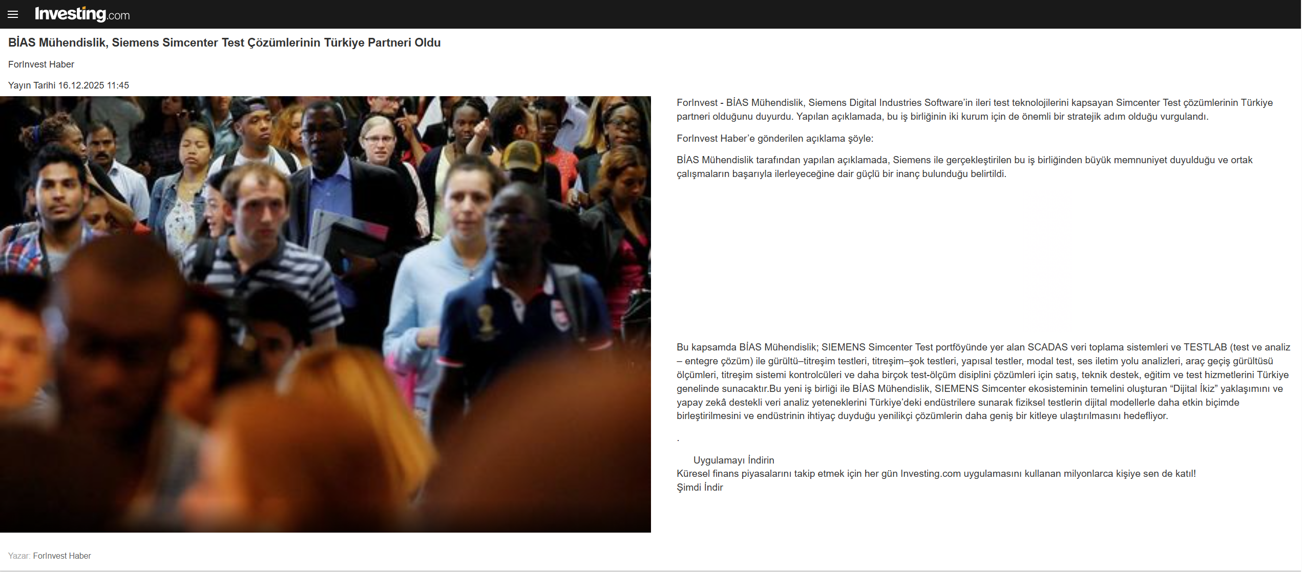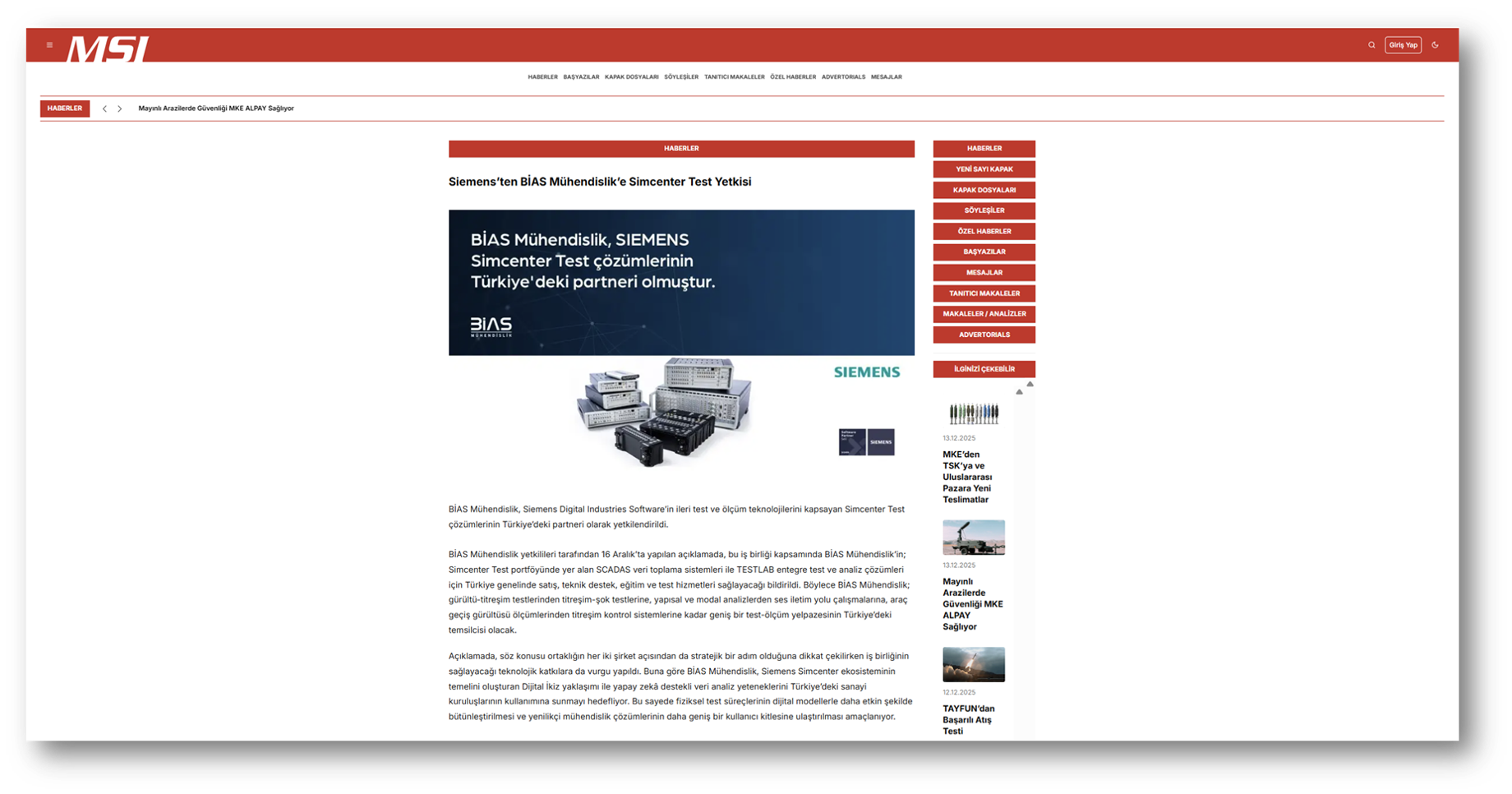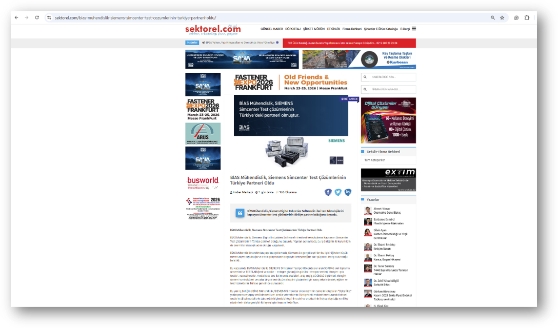 BİAS Mühendislik’in, Siemens Simcenter Test çözümlerinin Türkiye’deki yetkili partneri olduğu iş birliği; basın, dijital yayınlar ve sektörel mecralarda yer alarak kamuoyuna duyurulmuştur.